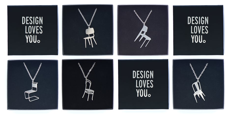 The collection of DESIGN LOVES YOU includes t-shirts, brooches, necklaces, silkscreen printed posters and decorative pillows. All for sale online at www.designlovesyou.com and partly for sale off line in various (museum)shops such as the Centre Pompidou in Paris, the Design Museum in London, the Bauhaus Museum in Dessau and the Thonet Museum on Frankenberg.
