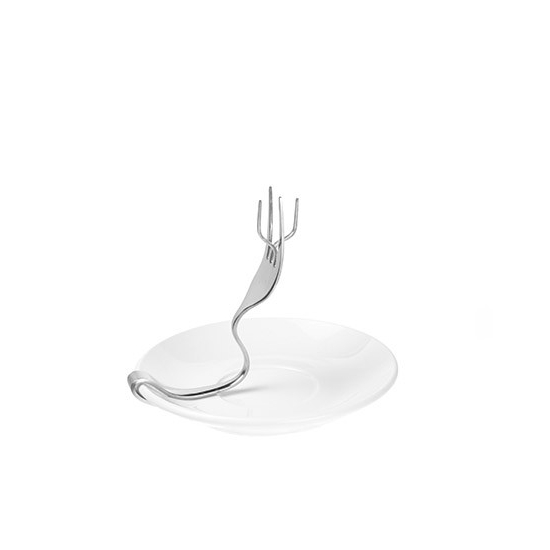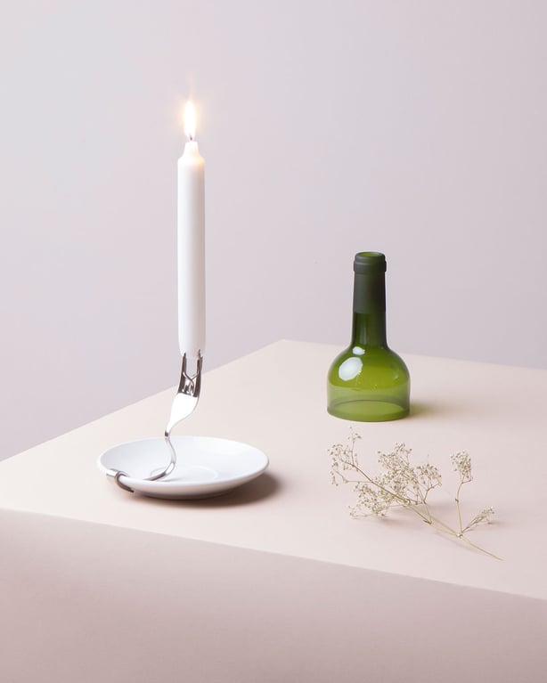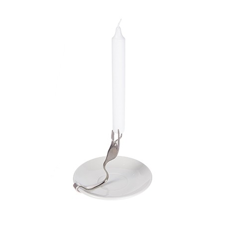 Plate and bended fork go through life together as a candle holder. Comes with saucer and candle. So you can light your fire at once!