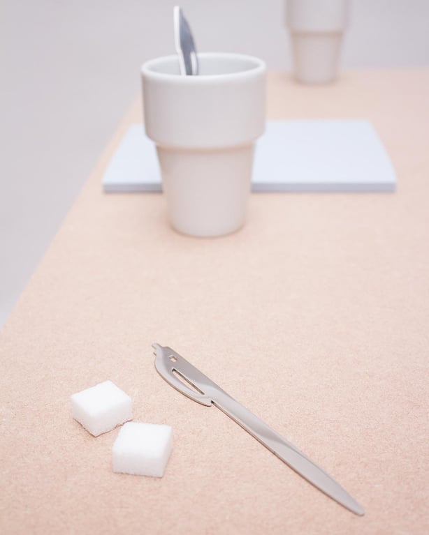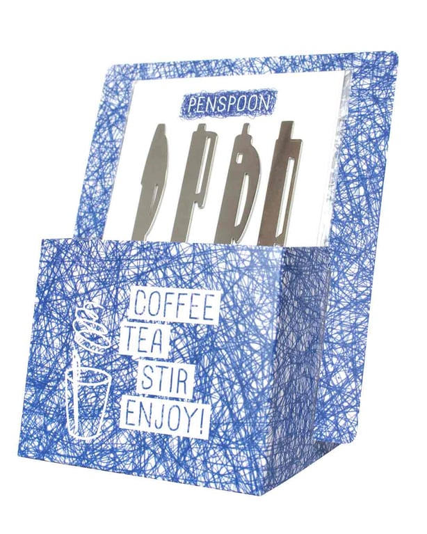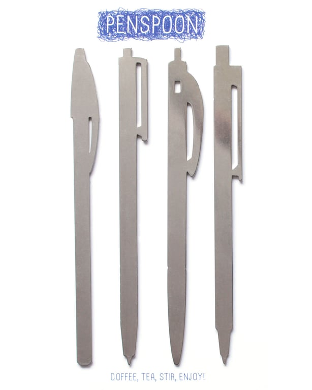 A stirrer that looks like a pen. The shape of each spoon is based on the outline of a famous ballpoint. There are four different stirrers.